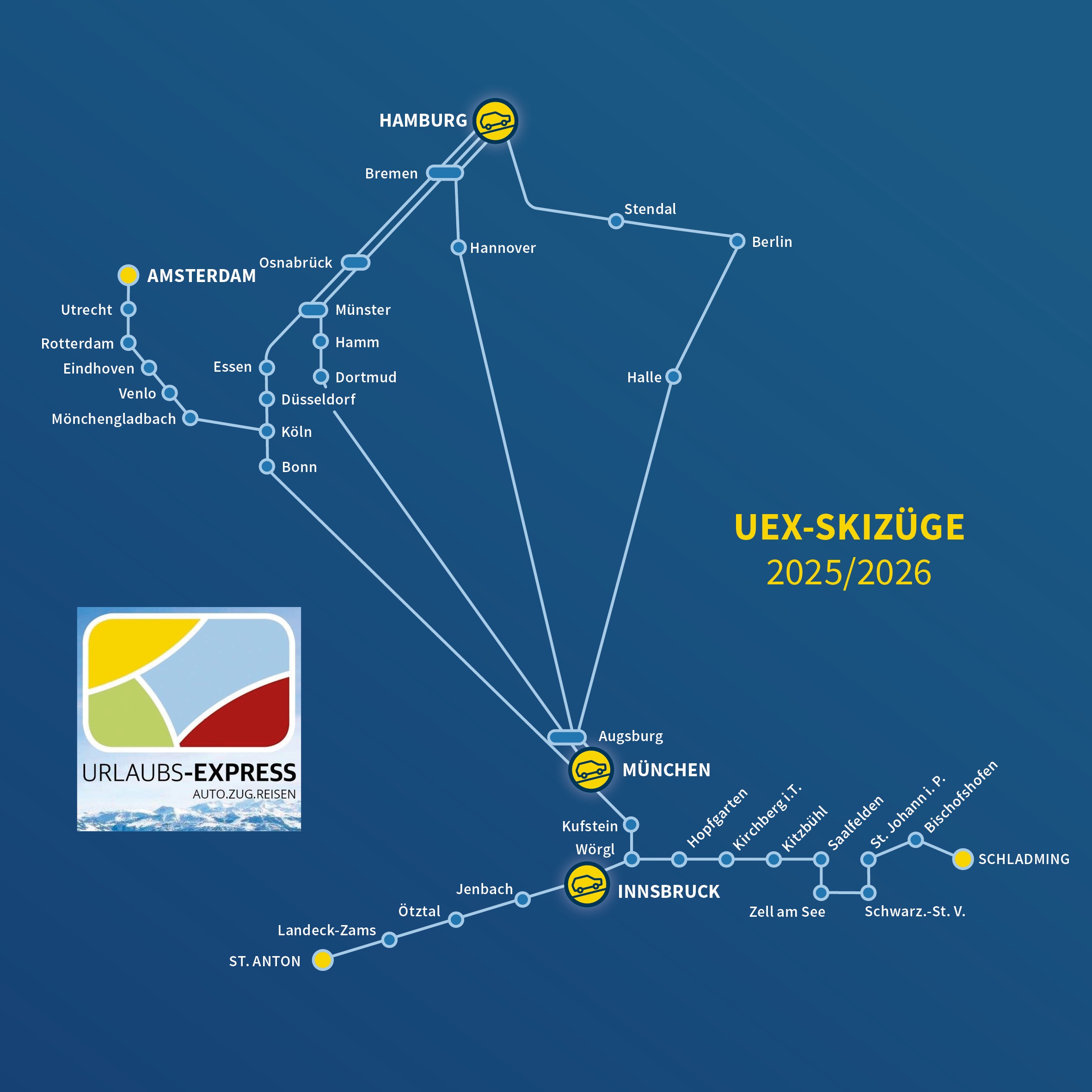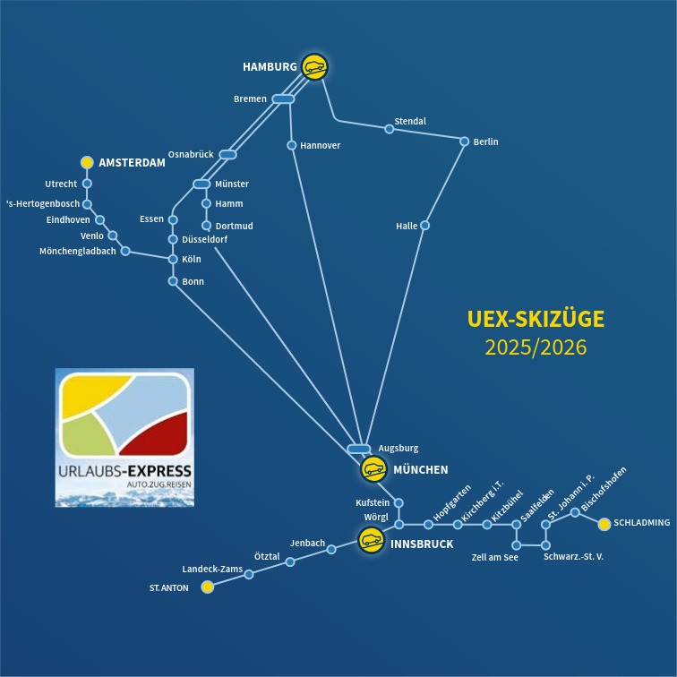 Auch der beliebte UEX-Autoreisezug ist in der Wintersaison 2025/26 wieder buchbar – für alle, die ihr Auto stressfrei mit in den Urlaub nehmen möchten, ganz ohne Stau und Schneeketten. Früh buchen lohnt sich! Sichere dir attraktive Startpreise und genieße eine bequeme, klimafreundliche Anreise mit dem UEX Night – deinem Nachtzug in die Alpen.